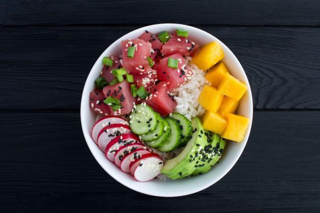 - Podemos añadir al bowl más vegetales y frutas: el mango queda espectacular, el aguacate también, pimiento rojo picado, rabanitos, pepino… Se puede incluir algún alga, pero cuidado con su consumo excesivo.
